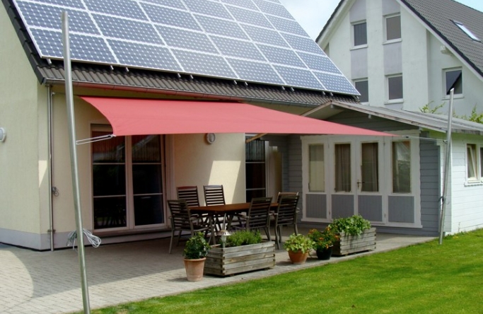 Die Möglichkeit, Sonnensegelanlagen harmonisch in die Architektur von Haus und Garten zu integrieren, kommt besonders anschaulich zur Geltung.